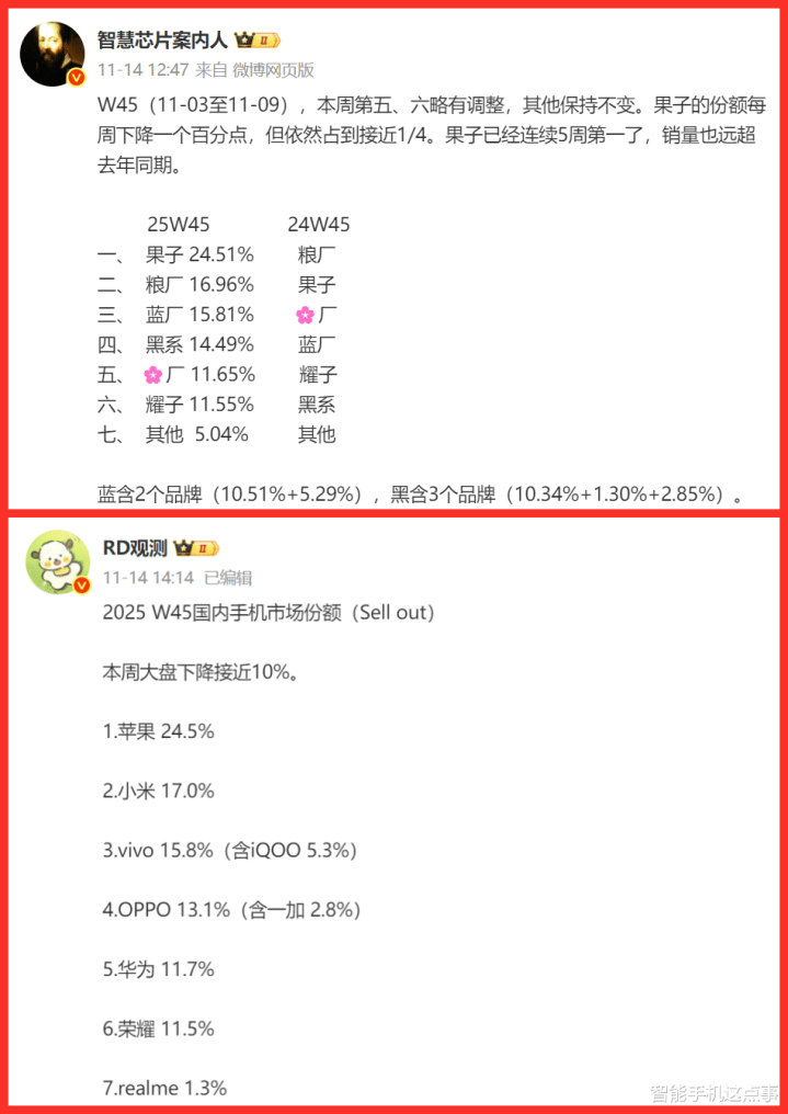 而根据博主透露的数据来看,苹果这周还是第一,占了24.51%,已经连续五周坐稳这个位置了,卖得也比去年好。